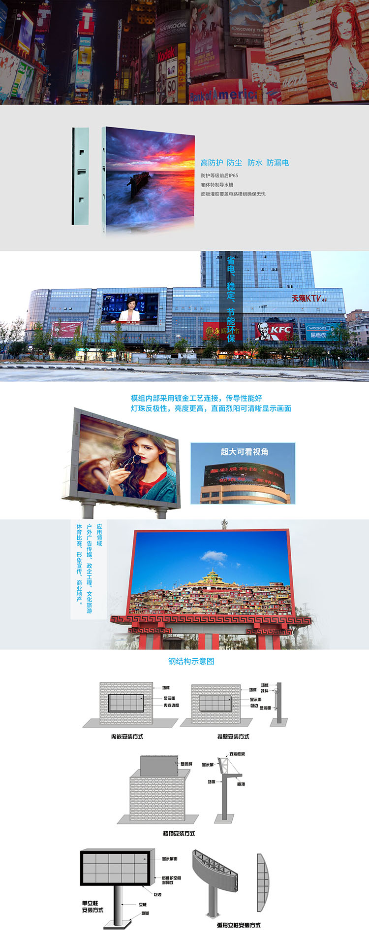 廣泛應(yīng)用于:大型會場、廣場、體育場館、政府機關(guān)、航站、碼頭、車站、證券市場及其它交易市場、電力、展覽館等多種需要進行宣傳、廣告、信息發(fā)布、導(dǎo)引的場所。