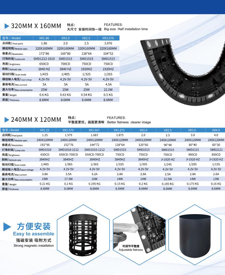 P2.5這款軟模組系列,統(tǒng)一240mm*120mm尺寸 ,軟模組、柔韌好、任意可彎曲,柔性LED顯示屏模組,發(fā)明設(shè)計(jì)巧妙來(lái)自于軟燈條的理念結(jié)合施工效率高;柔性LED顯示屏模組能根據(jù)需要拼接弧形屏,圓柱,曲面等顯示屏,是一個(gè)具有突出性特點(diǎn)和顯示進(jìn)步的技術(shù)改進(jìn)。