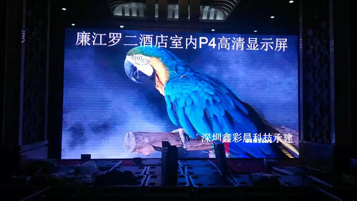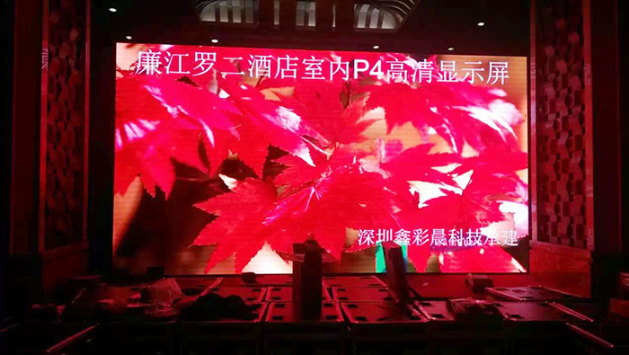 江羅二酒店p4全彩led顯示屏租賃屏安裝調試完畢,由深圳廠家鑫彩晨科技有限公司承辦。