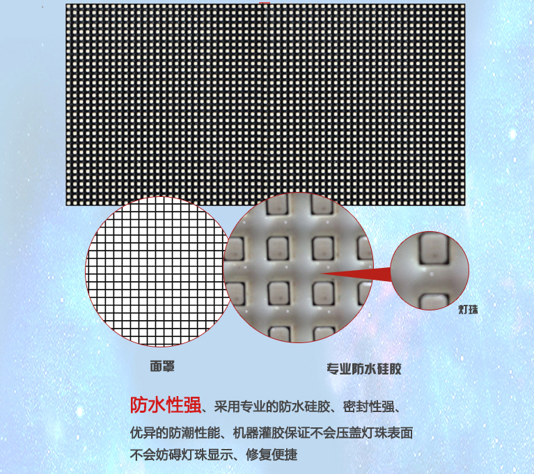 其一所有模組最外層都有著特質(zhì)的導(dǎo)水槽,此導(dǎo)水槽的作用是阻擋顯示屏表面的水分過多的滯留在產(chǎn)品上,起到引導(dǎo)水分流失的作用,不僅如此此導(dǎo)水槽還能分隔燈珠之間的相互影響讓圖像更加清晰;